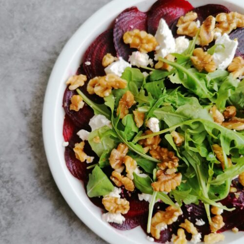Rotebeete Carpaccio mit Ziegenkäse, Walnüssen und Rucola