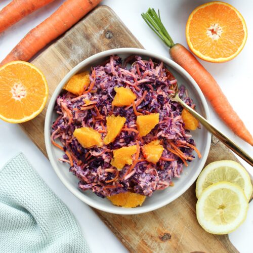 Mein veganer Rotkohl Slaw mit Orangen ist eine gesündere Abwandlung des klassischen amerikanischen Krautsalats, der Coleslaw genannt wird. Im Gegensatz zu diesem kommt er nämlich ganz ohne Industriezucker aus und bekommt seine angenehme Süße von einem Spritzer Ahornsirup und frischen Orangen verliehen. Die Grundlage für den Rotkohlsalat mit Orangen bilden frischer roher Rotkohl und rohe Karotten. Damit ist der vegane Rotkohl Slaw sehr gesund und eine tolle Möglichkeit, mehr Rohkost in deine Ernährung einzubringen. Der Rotkohlsalat mit Karotten und Orangen passtrichtig gut zu veganen oder vegetarischen Burgern und zum Grillen kannst du ihn auch super mitbringen. Du kannst den Salat auch ohne Probleme schon einen Tag vorher zubereiten und im Kühlschrank aufbewahren. Hast du schon mal Coleslaw mit Rotkohl probiert? Wenn nicht, wird es jetzt höchste Zeit! 🙂