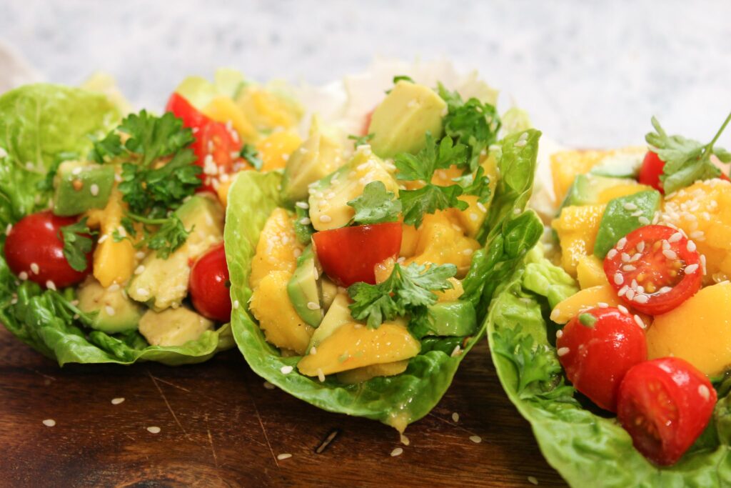 Ich liebe Früchte gemischt mit Gemüse. Früchte geben diesem Rezept eine Frische und der süße Geschmack passt überraschend gut. Dazu passt eine cremige, reichhaltige Avocado. Cocktailtomaten schmecken ebenfalls etwas süßlich. Der Rohkost Taco kommt komplett ohne Soße aus. Es wird lediglich mit Salz, Pfeffer und Limettensaft gewürzt.