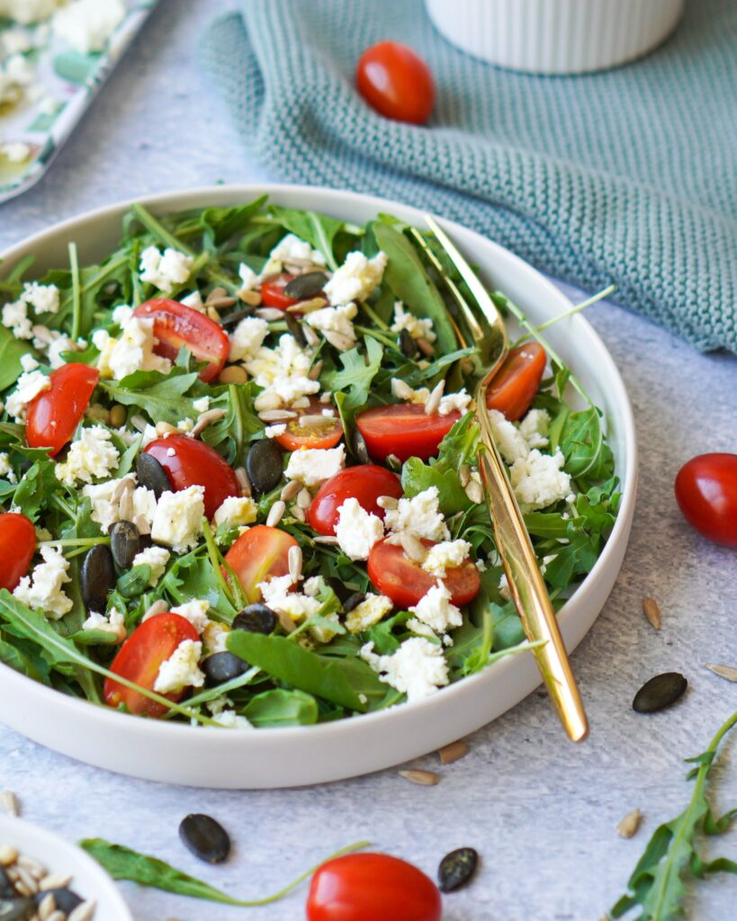 Diesen einfach mediterranen Rucola Salat mit Feta und Tomaten musst du unbedingt einmal probieren. Er ist in unter 10 Minuten zubereitet und zaubert italienisches Flair auf deinen Teller. Erfahre jetzt, wie du den Rucola Salat einfach zubereiten kannst.