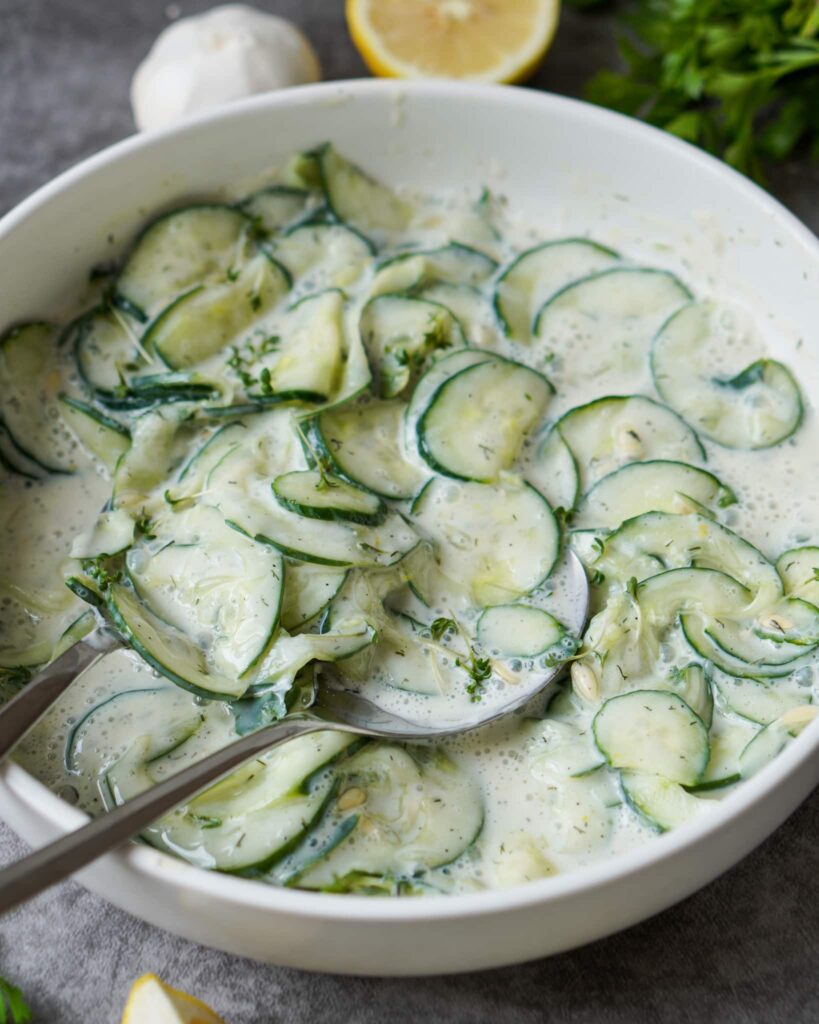Es gibt viele verschiedene Varianten des Klassikers Gurkensalat. Meine ist definitiv die mit einem cremigen Joghurt Dressing. Er ist die perfekte gesunde Beilage und super geeignet, wenn du ein paar Kilos verlieren möchtest. In meinem Rezept habe ich mich für Soja Joghurt entschieden – somit ist das Rezept vegan.