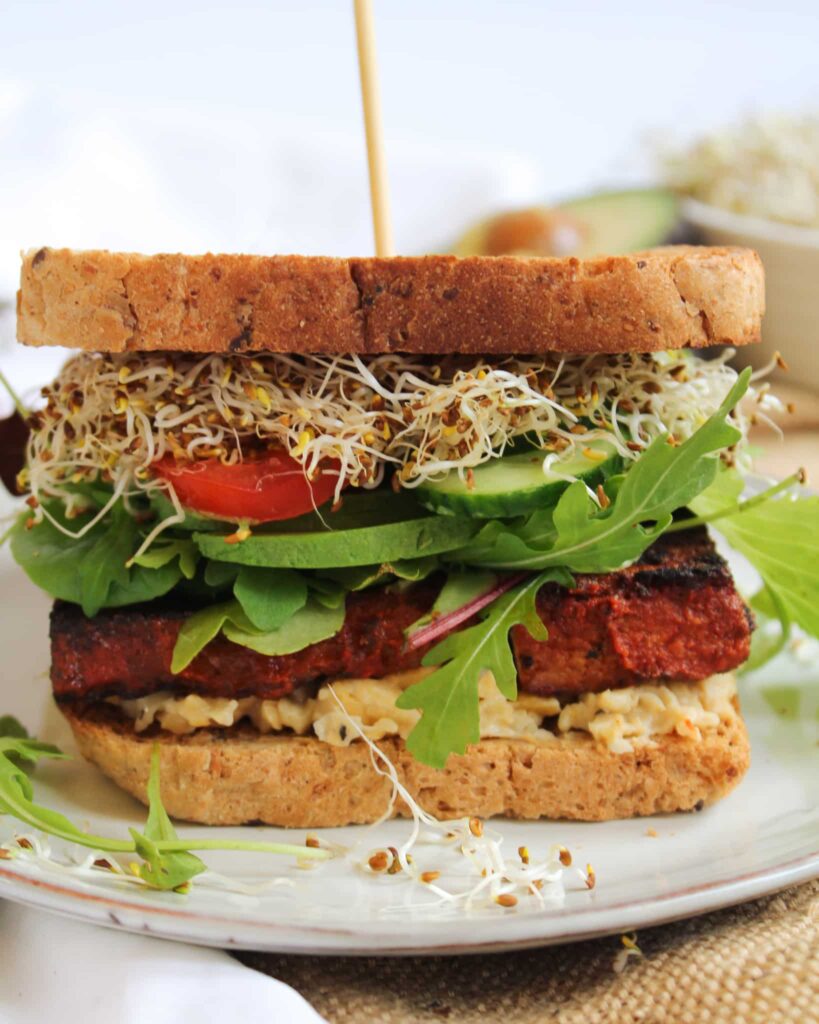 Dieses Sandwich sieht super aus und schmeckt auch so. Verschiedene Schichten in vielen bunten Farben zaubern eine vielseitiges Geschmacksuniversum her. Ein roter Tofu, indem Tomaten mitverarbeitet wurde, etwas Hummus, Avocado und frische Sproßen liefern alle wichtigen Nährstoffe . Frischer Ruccola, Gurkenscheiben und ein paar Tomaten runden das Sandwich mit vielen Vitaminen ab.
