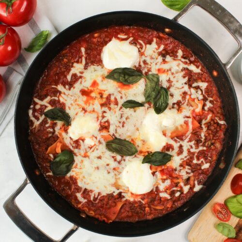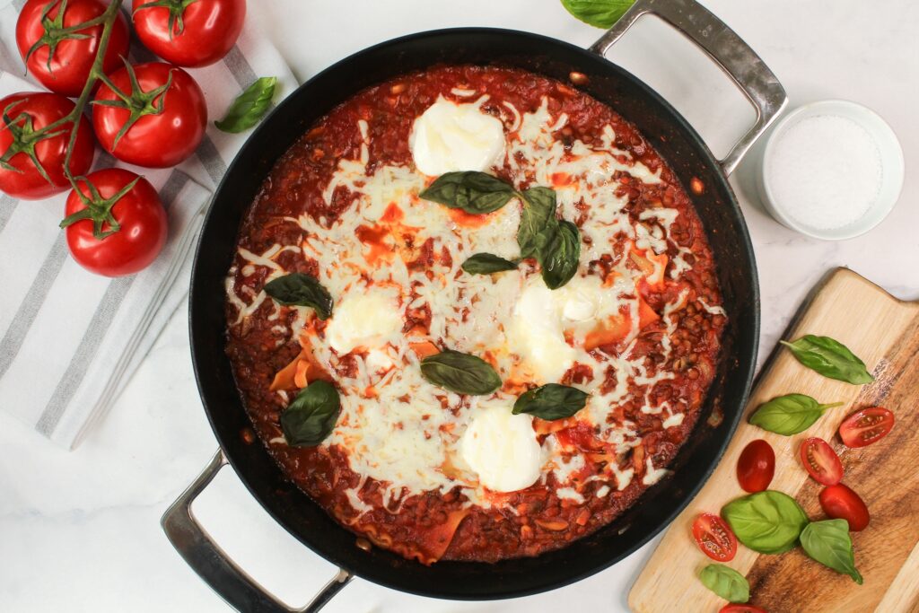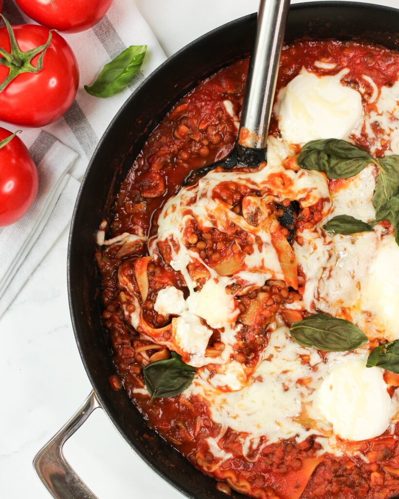 Vegetarische Lasagne aus der Pfanne mit Linsen