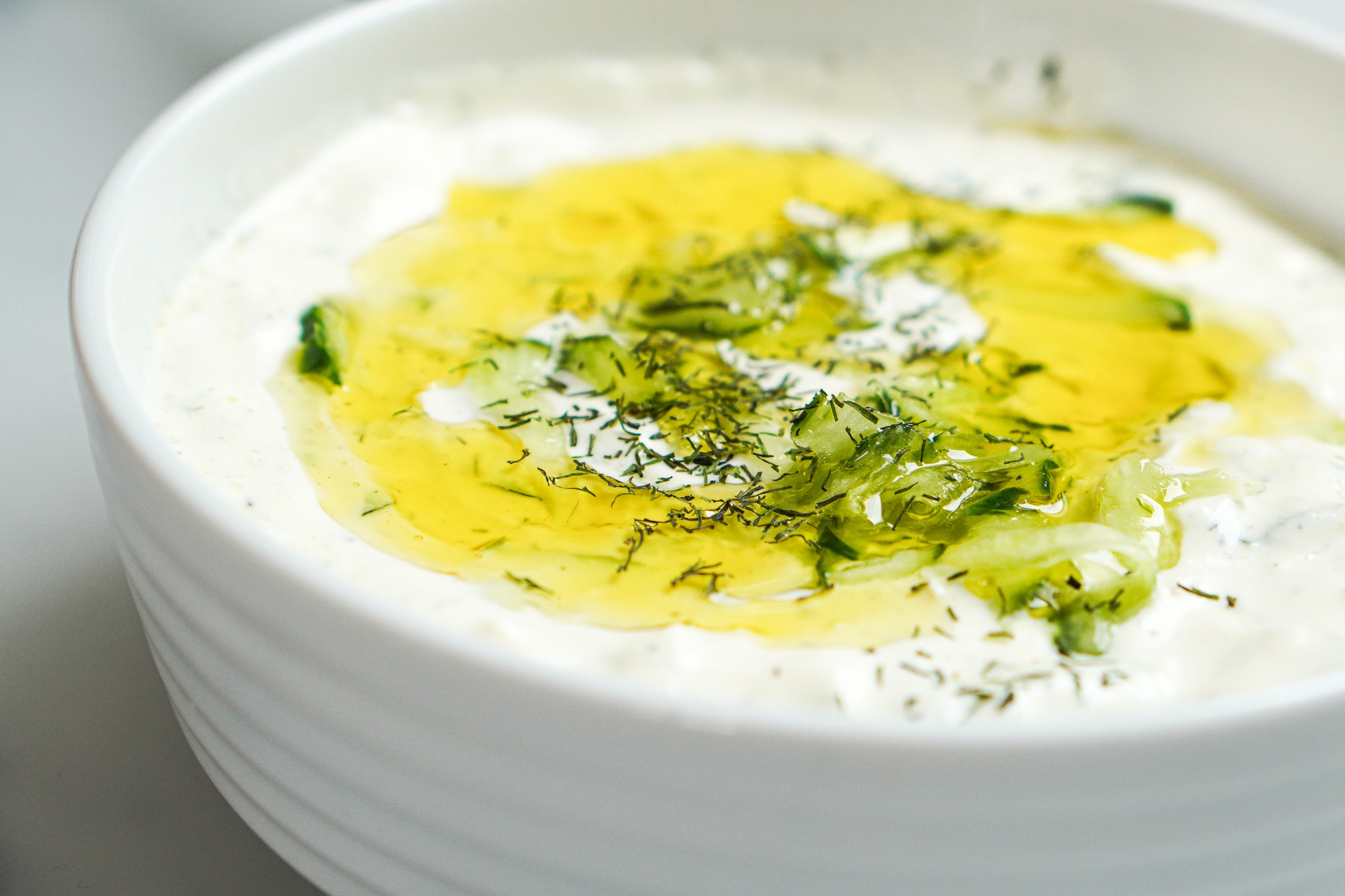 - Die Gurke, das Olivenöl, den Griechischen Joghurt, Salz, Pfeffer und den Dill vermischen.