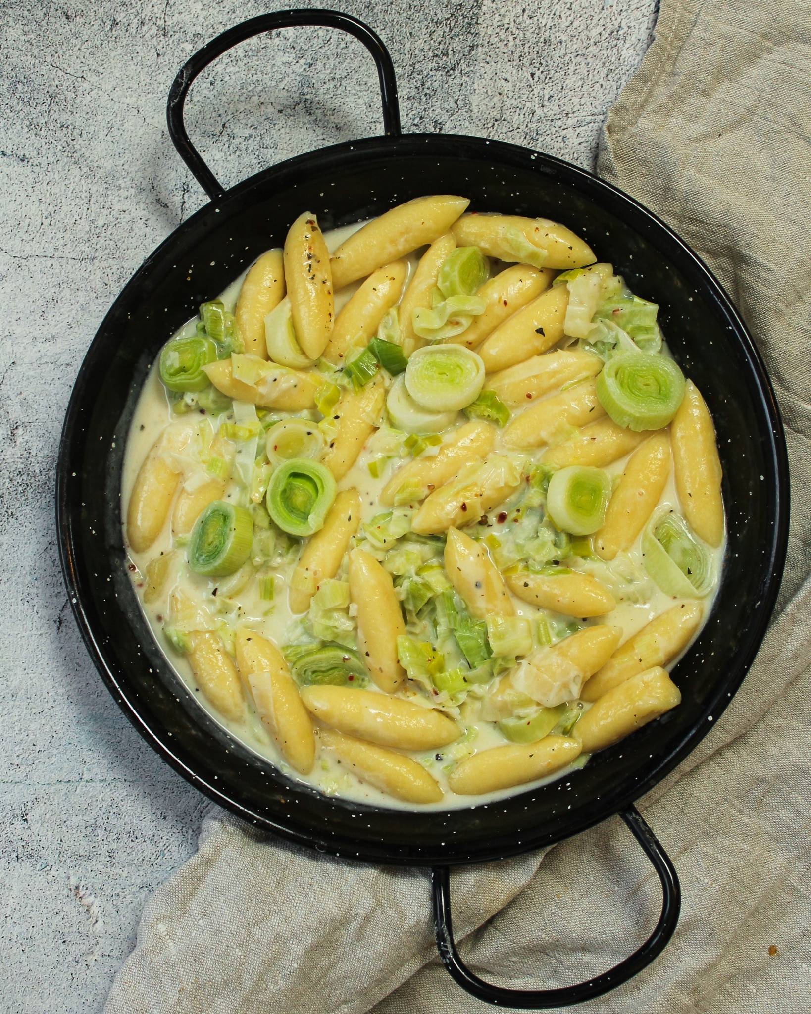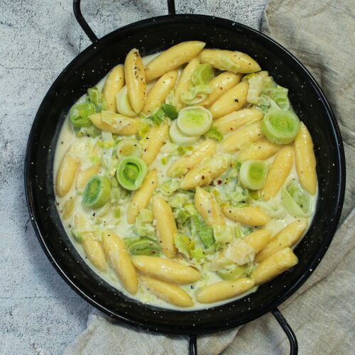 Diese Schupfnudeln sind etwas ganz besonderes. Eine leckere Soße aus Schmelzkäse, Sahne und Lauch ergeben eine schnelle, leichte Wintermahlzeit. Gerade für diejenigen, die gerne lokal und regional einkaufen, ist Lauch ein wunderbares Wintergemüse. Er ist schnell und leicht zubereitet. Man muss ihn nicht lange kochen, wie das bei vielen andere Wintergemüsen nötig ist.