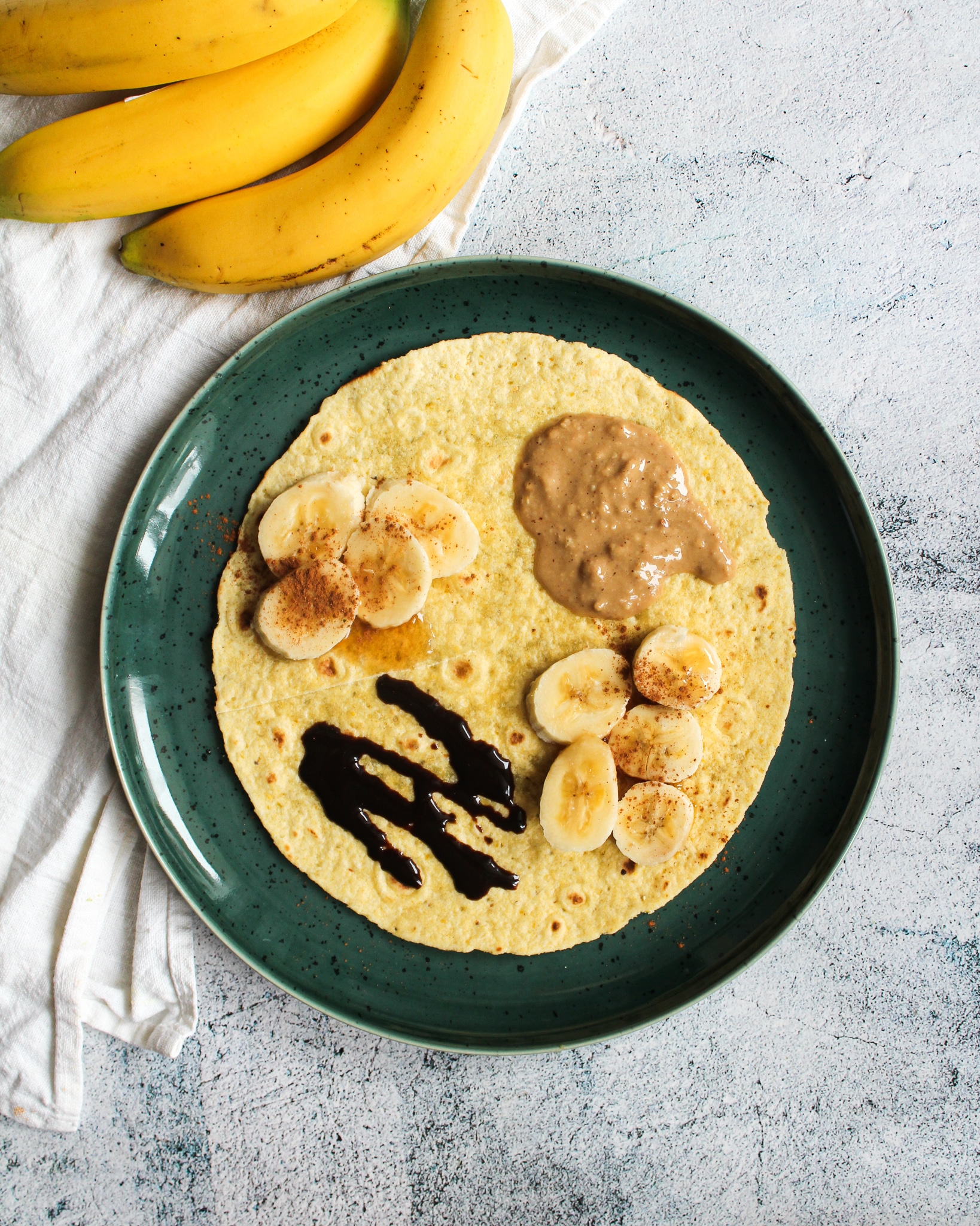 - Tortilla von der Mitte aus einmal einschneiden. Zutaten wie auf dem Bild auf dem Tortilla verteilen. Und nun im Uhrzeigersinn übereinander klappen. Ich habe mit den Bananen begonnen und diese über das Erdnussmus geklappt usw.