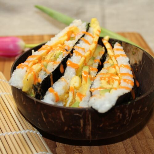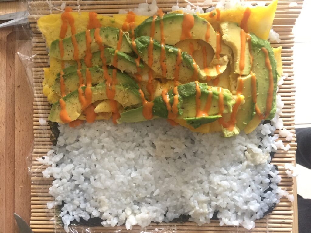 - Noriblatt auf eine Sushi Matte mit Glassichtfolie geben und komplett mit Reis bestreichen. Die Hälfte des mit Reis bedeckten Blatts mit Avocado und Ei belegen und mit Spiracha Soße würzen. Dann das Noriblatt mit der nicht belegten Seite über die Belegte klappen und festdrücken.