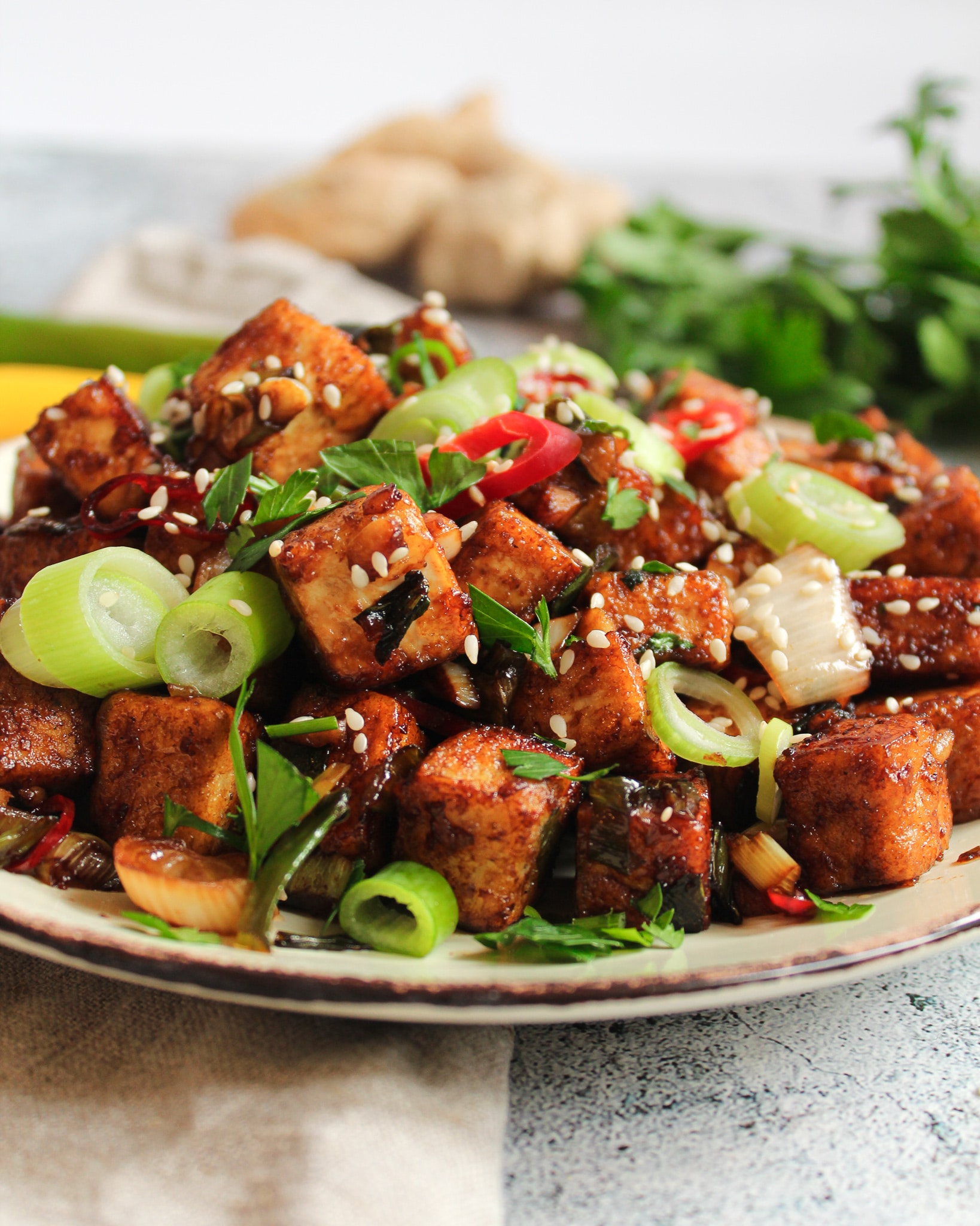 Asiatischer crunshy Tofu mit Frühlingszwiebeln