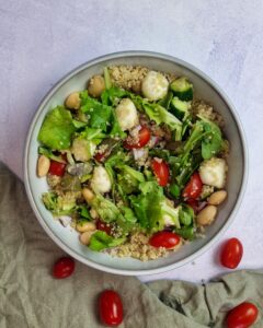 - Kleine Mozzarella Stückchen oder geriebenen Mozzarella darüber geben und ca. 30 Minuten bei 200 Grad backen.