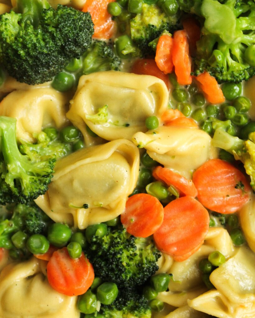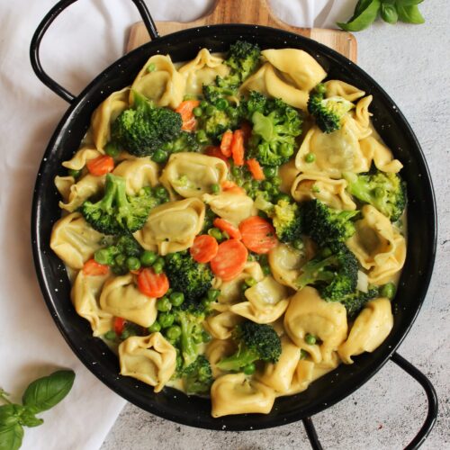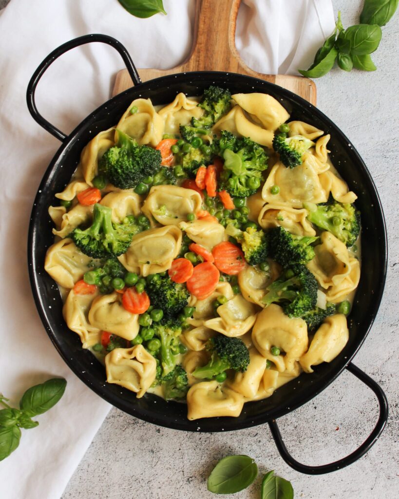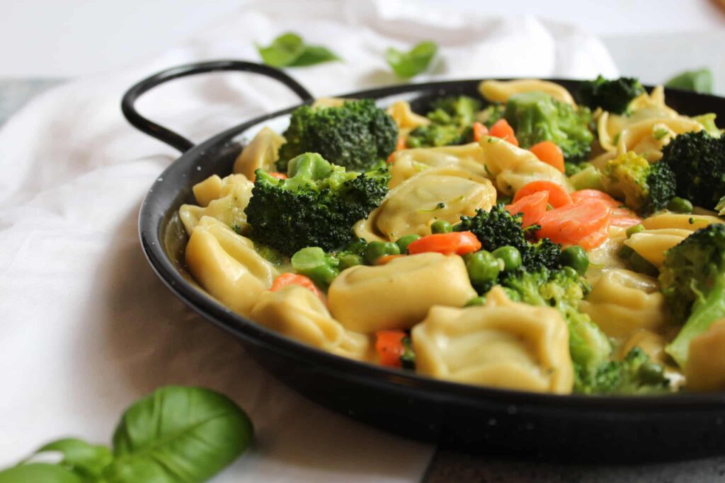 Pasta-Gerichte sind immer eine gute Idee, und die Vielfalt an Variationen scheint unendlich. Heute stelle ich ein Pasta Gericht mit einer cremigen Käse-Sahne-Soße vor. Vermischt mit Brokkoli, Erbsen und Karotten ergibt es eine vollwertige, ausgeglichene Mahlzeit. Statt Tortellini könnt ihr natürlich auch jede andere vorgekochte Pasta aus dem Kühlregal verwenden.