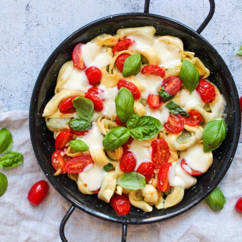 Ein super schnelles und einfaches Rezept mit Tortellini, dass dir mit Sicherheit deinen Abend versüßen wird. Das Rezept kommt mit nur 5 Zutaten aus und ist trotzdem eine leckere und vollwertige Mahlzeit. Zusammen mit den frischen Tomaten und dem Basilikum ist sind die überbackenen Tortellini wahrhaftig ein Traum.