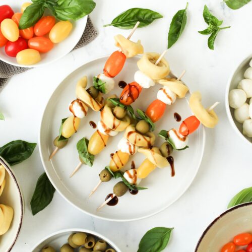 Meine Tortellini Spieße mit Tomate und Mozzarella sind das perfekte Fingerfood zum Mitnehmen auf Partys, zu deinen Freunden oder zu einem Picknick im Grünen. Das Fingerfood ist vegetarisch und gut vorzubereiten, weil die Tortellini Spieße kalt serviert werden und du außer den fünf Zutaten nur ein paar Holzspieße brauchst. Auf die Spieße fertig los! 🙂