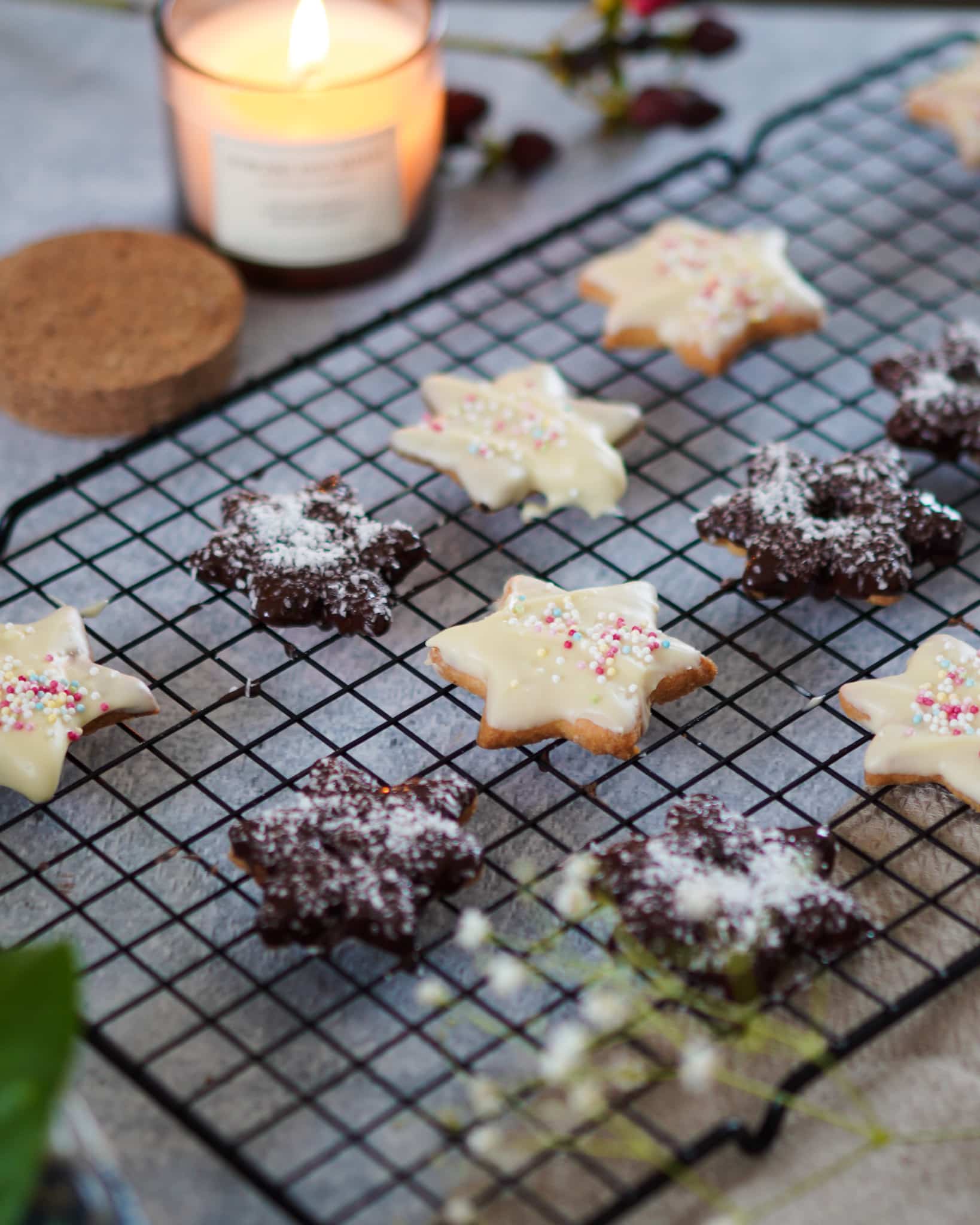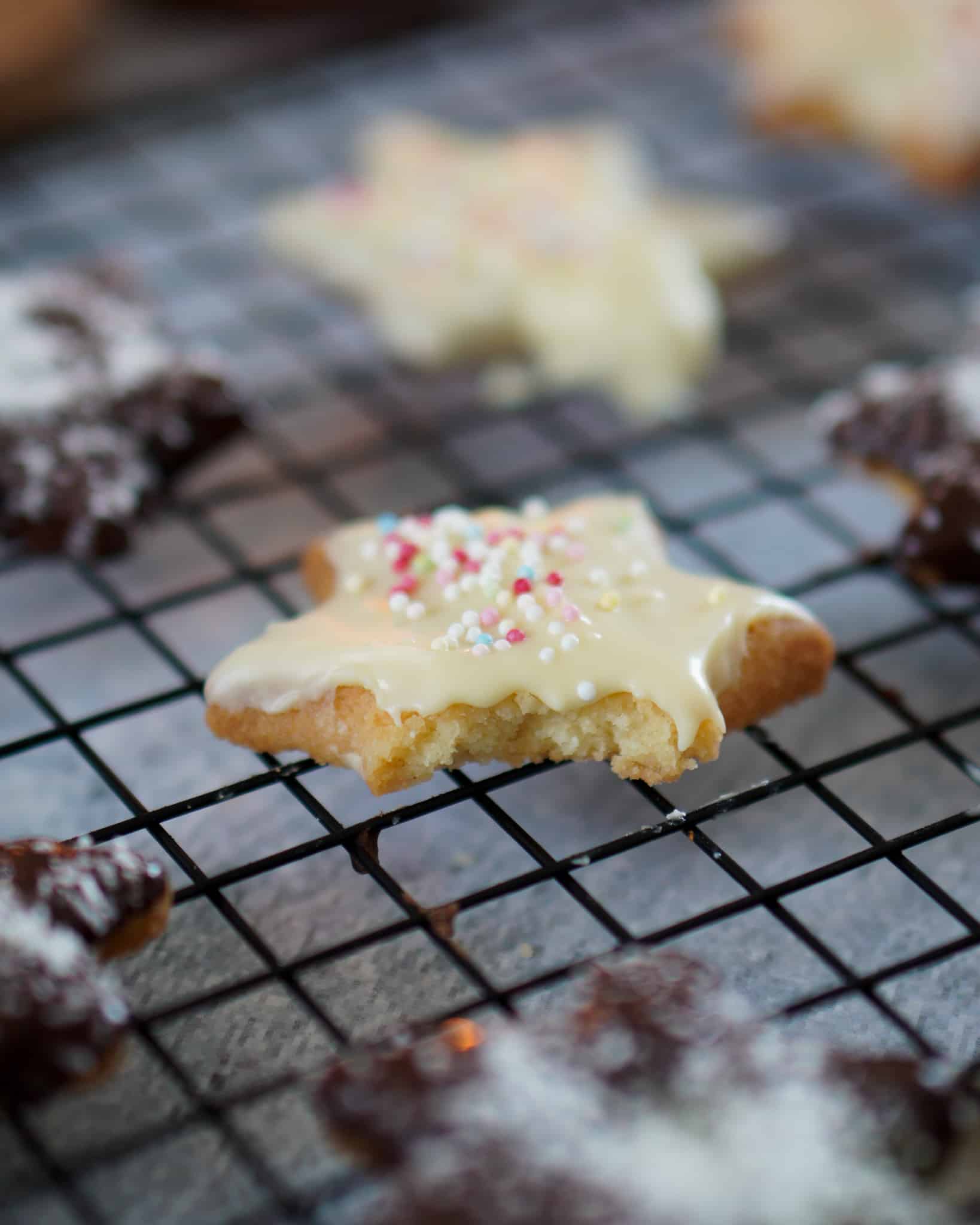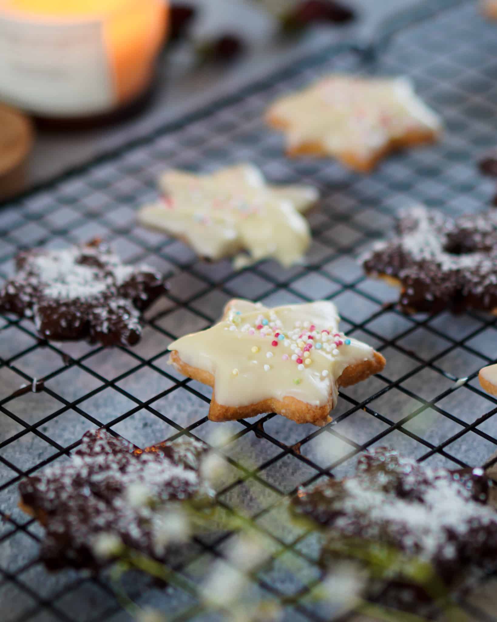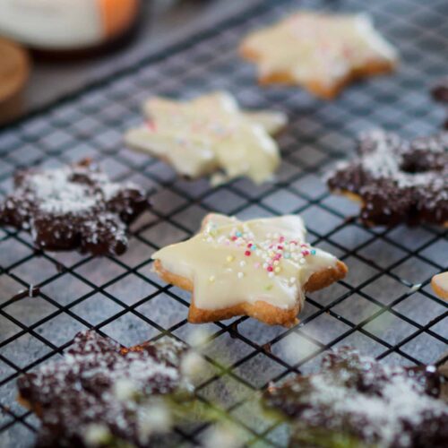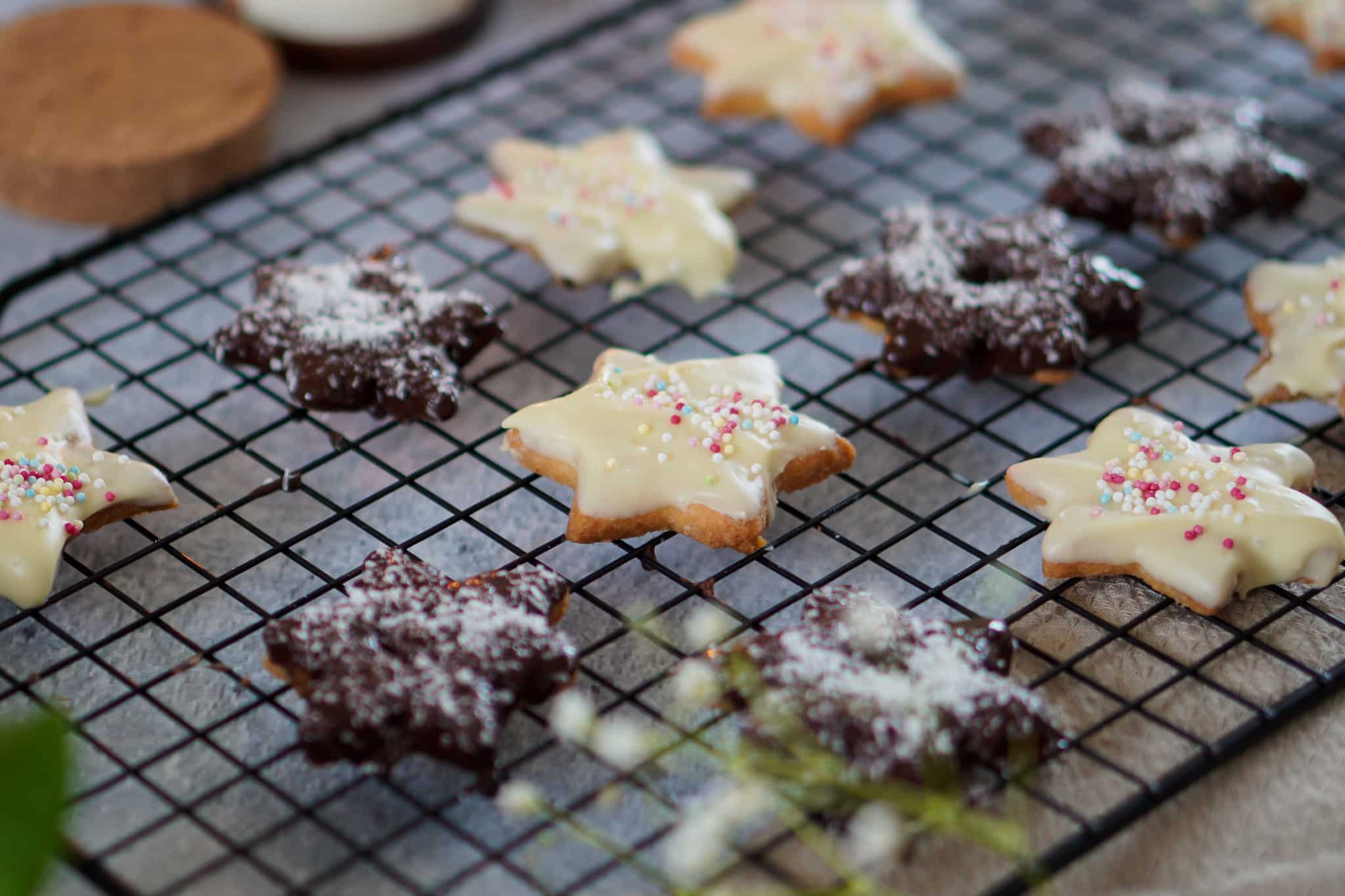 - Für den Zuckerguss das Erythrit mit Wasser oder Zitronensaft anrühren und über die Plätzchen streichen
