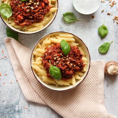 Linsenbolognese ist eine vegane Alternative zur klassischen Sauce Bolognese. Diese Pastasoße wird mit roten Linsen hergestellt. Sie ist sehr einfach und schnell zubereitet, denn die kleinen, roten Linsen müssen nicht mal eingeweicht werden.
