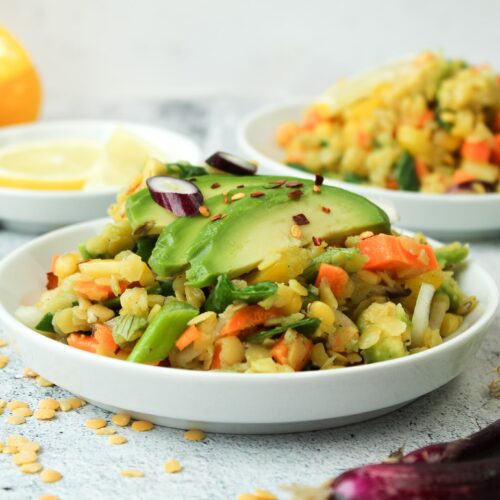 Veganer gelbe Linsen Salat mit Avocado