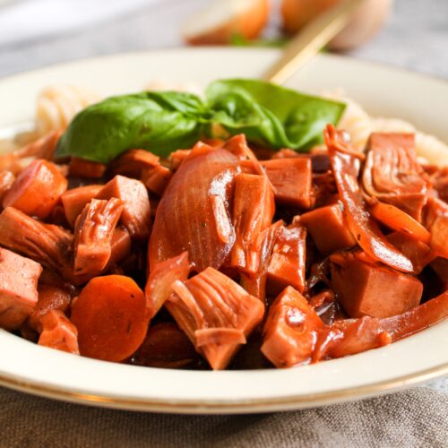- Die Jackfruit-Textur und -Geschmack sind perfekt für die Zubereitung von Gulasch.