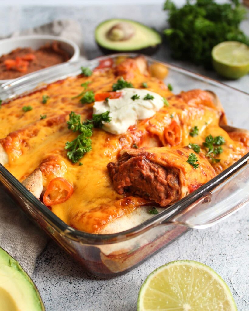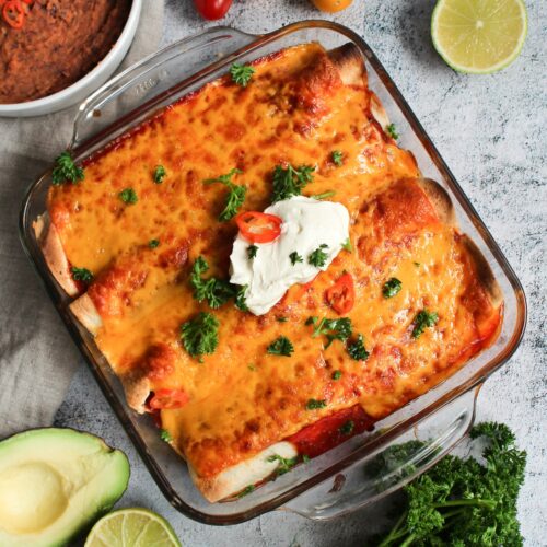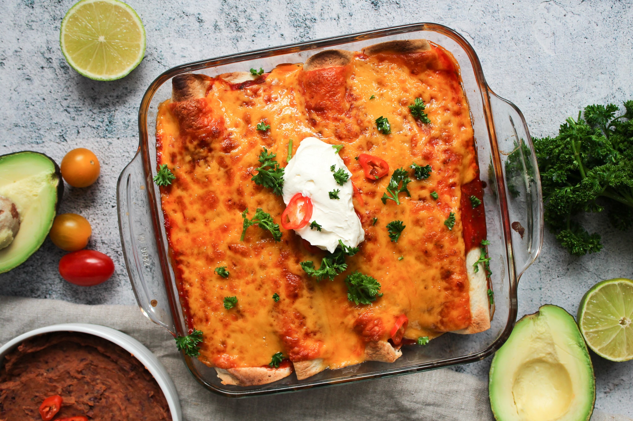 Mexikanisches Essen liegt weltweit im Trend, denn seien wir mal ehrlich: wer mag eigentlich kein mexikanisches Essen? Mein Rezept für vegetarische Enchiladas mit Kidneybohnen ist abgeleitet von dem original Enchilada – Rezept mit Hühnchenfleisch. Ich verwende Maistortillas und mit einer Füllung aus Kidneybohnen, Käse und Schmand sind sie einfach nur lecker. Die Wraps werden mit einer Paste aus Kidneybohnen gefüllt und dann mit Cheddar im Ofen überbacken. Ein tolles vegetarisches Gericht für Fans mexikanischer Gerichte.