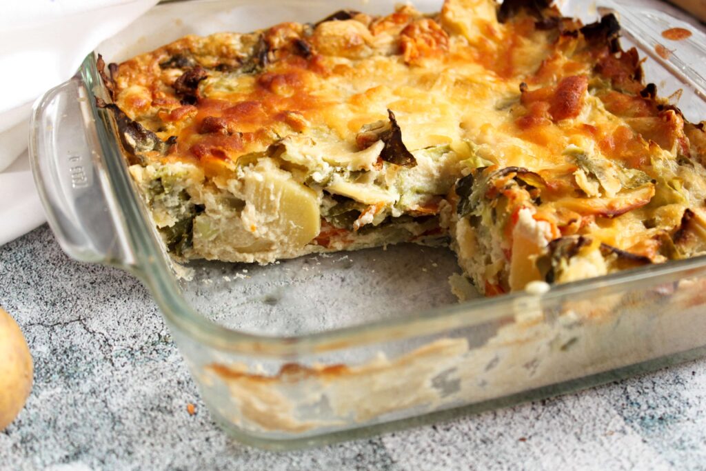 Kartoffeln und Karotten ergänzen dem Gericht geschmacklich und farblich und machen es zu einem vollwertigen Hauptgericht. Geschmolzener, flüssig-zäher Gouda Käse rundet den Auflauf fantastisch ab.