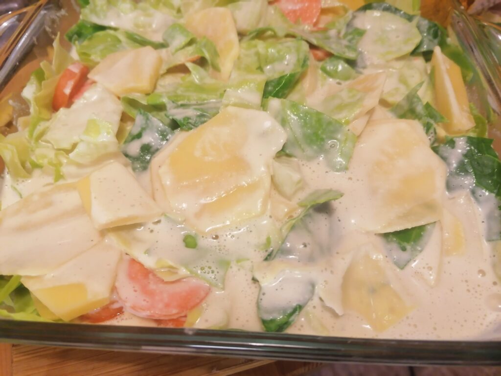 - Alles in eine Auflaufform geben und Soße darunter mischen.