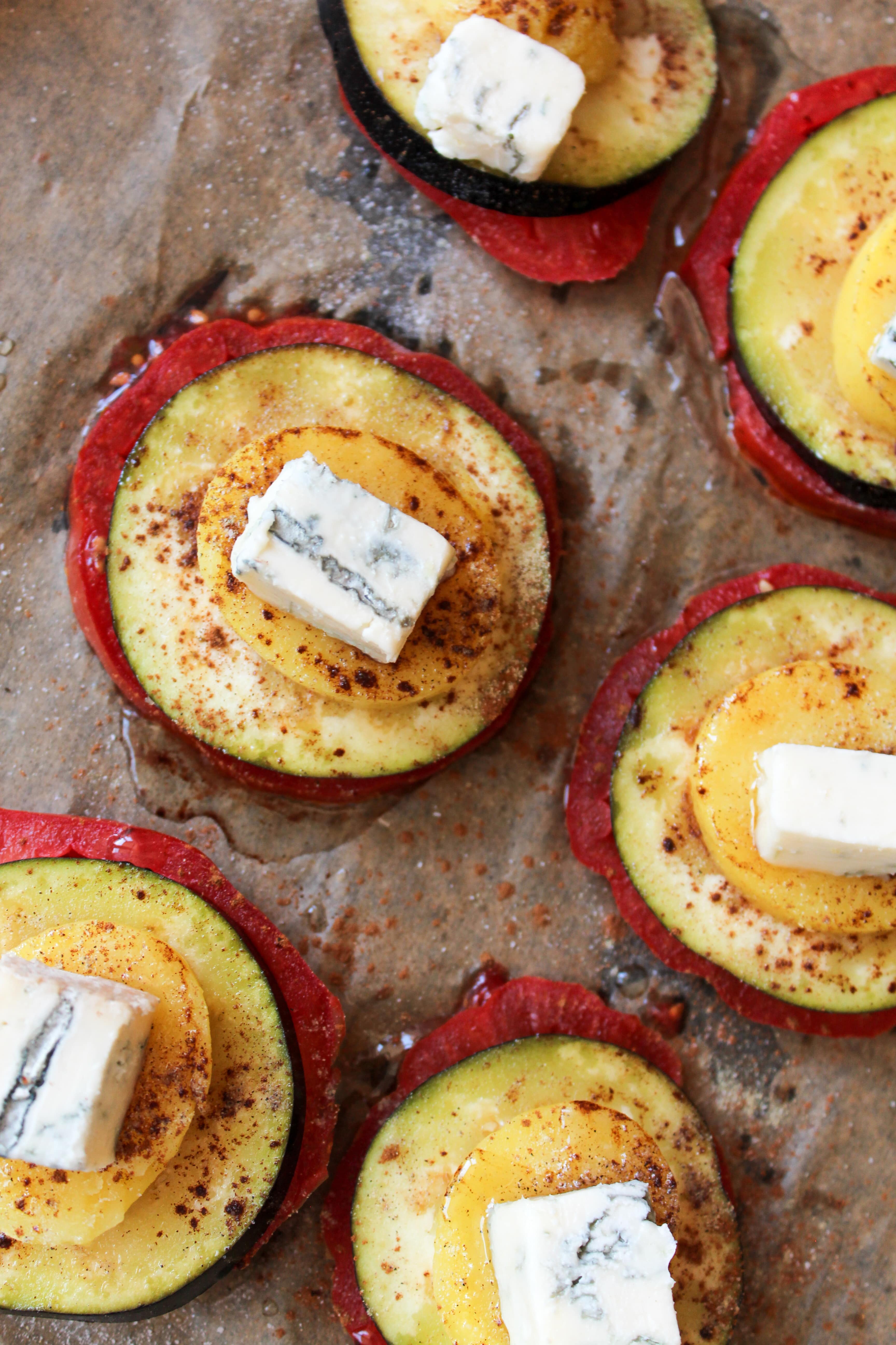 Dieses dekorativ gebackene Menu sieht nicht nur schön aus, sondern ist nahrhaft und lecker. Lagen von Tomaten, Aubergine und Kartoffeln getoppt mit Gorgonzola und ergeben ein genussvolles Aroma und schmeckt dank dem italienischen Schimmelkäse leicht rezent. Die runden Schiffchen ergeben ein idealer Snack für ein Buffet, oder sie eignen sich genauso als Haupt- oder Vorspeise. Die roten Tomatenscheiben, grüne Aubergine und die gelblichen Kartoffeln zeichnen einen hübschen Farbtupfer mit einem kleinen Würfel Käse als Hut. Dieses Rezept ist sehr einfach und die Schiffchen sind schnell und ohne große Probleme geformt. Das Beste daran ist, dass es trotzdem sehr speziell aussieht, obwohl es so einfach ist!