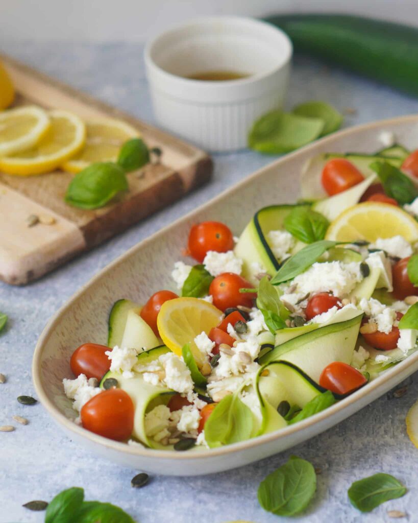 Du möchtest ein bisschen Abwechslung in deine Salatrezepte bringen? Dann ist dieser Zucchini Salat genau der Richtige für dich. Ob als Beilage, leichtes Abendessen oder für die nächste Party – der erfrischende Zucchini Salat schmeckt eigentlich immer. Auch zum Abnehmen eignet sich der Salat sehr gut, da er kalorienarm und eiweißreich ist.