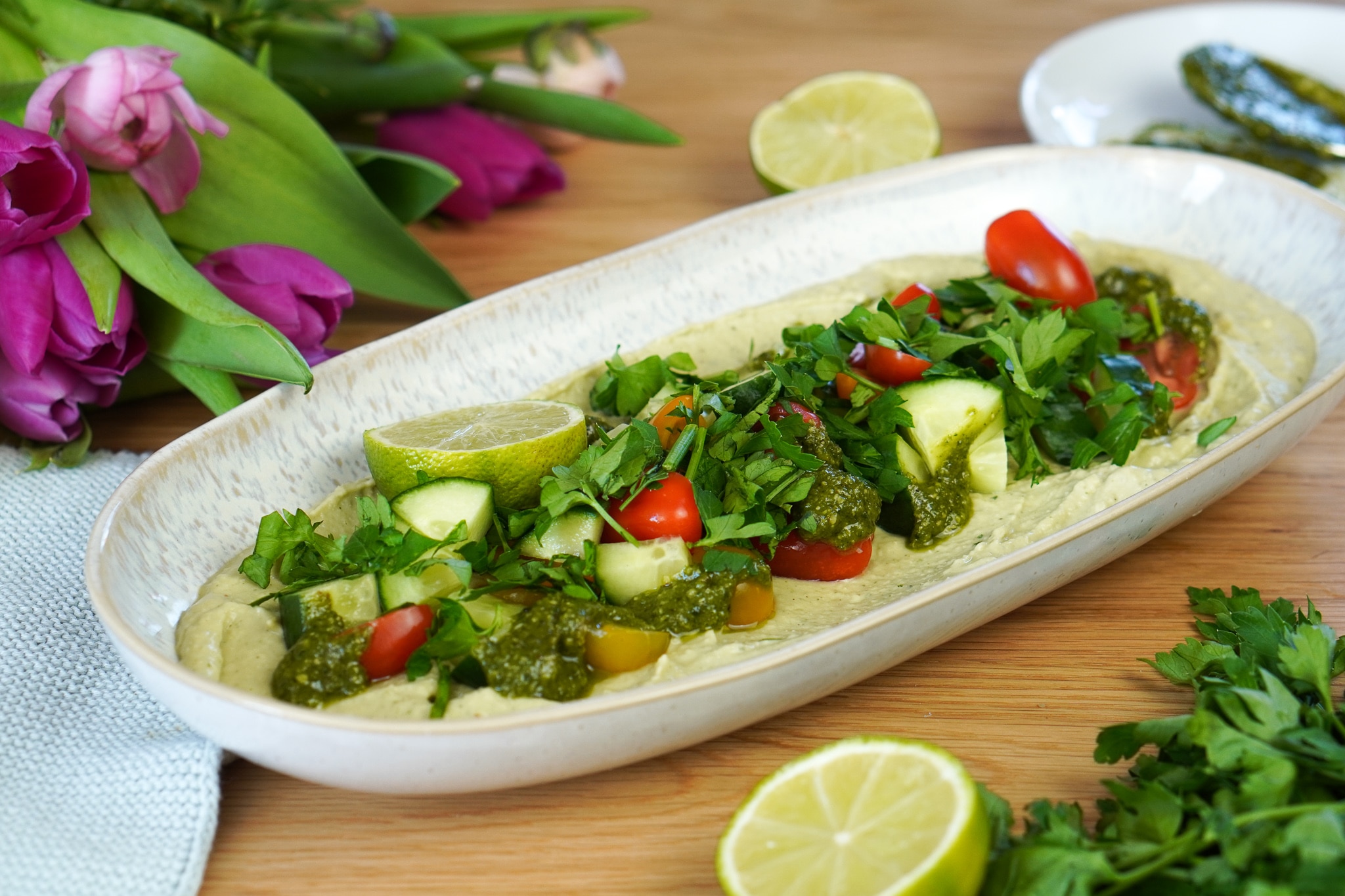 - Zum Schluss den fertigen Dip auf einer Platte oder in einer Schüssel anrichten und das Pesto darauf verstreichen.
