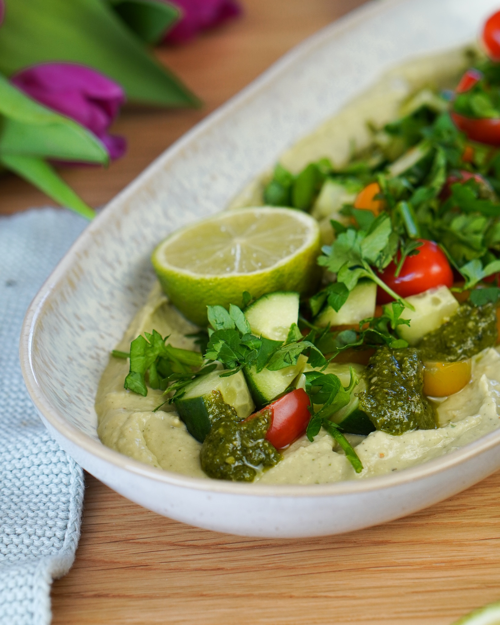 Wenn du möchtest kannst du noch frisches Gemüse wie Zucchini, Tomaten und Gurken als Deko verwenden. Auch frische Kräuter machen sich super auf dem Dip und geben ihm nochmal einen extra Geschmack.