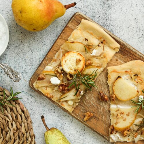 Flammkuchen mit Birne, Ziegenkäse und Walnüssen