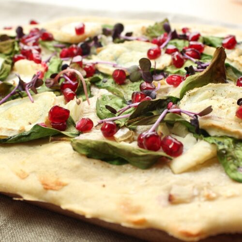 Nach dm Backen Granatapfelkerne auf den Flammkuchen geben und servieren!