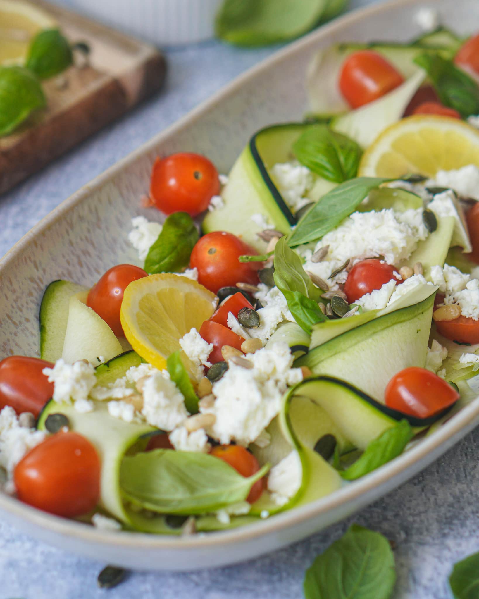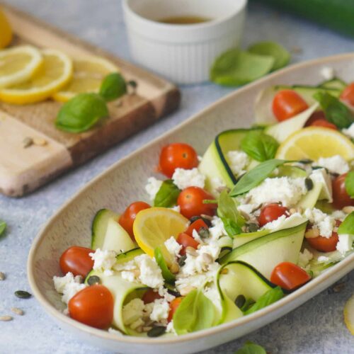 Da Zucchini nach kurzer Zeit Wasser ziehen, empfehle ich dir den Salat zeitnah zu verzehren. Zur Aufbewahrung im Kühlschrank ist er nur bedingt geeignet. Am besten schmeckt der Salat, wenn die Zucchini noch schön knackig sind.