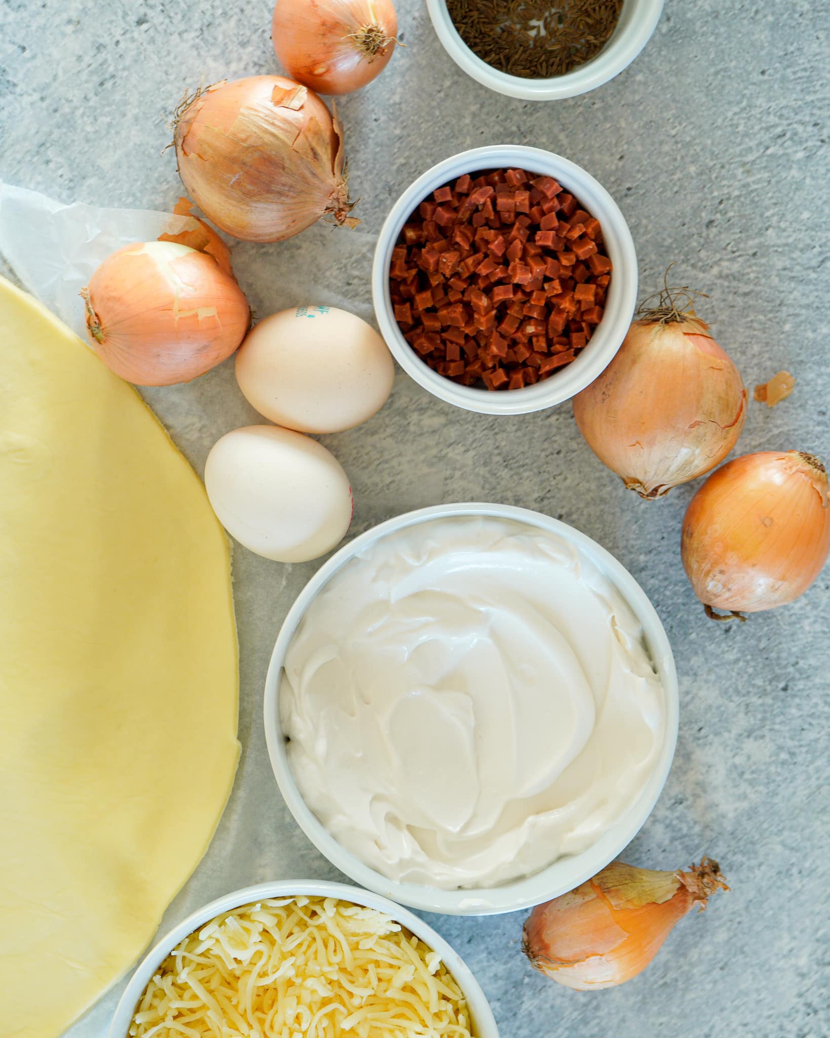 - Mürbeteig (Tart Teig): Der Mürbeteig bildet die Grundlage des Zwiebelkuchens. Er ist butterig und zart, was einen schönen Kontrast zur herzhaften Füllung aus Zwiebeln und Schmand/Creme Fraiche bietet. Außerdem sorgt er dafür, dass der Zwiebelkuchen eine knusprige Kruste hat.